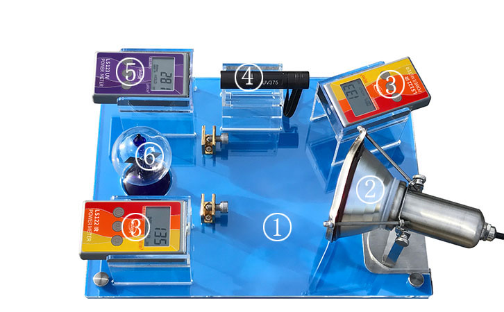 FS2150太陽膜反射測(cè)試儀用于展示太陽膜、隔熱玻璃等材料對(duì)光線的反射及阻隔效果。紅外線燈對(duì)面的LS122紅外功率計(jì)用于測(cè)試太陽膜,隔熱玻璃等的紅外線阻隔率,即隔熱效果;同側(cè)的LS122紅外功率計(jì)用于測(cè)試太陽膜,隔熱玻璃等的光反射能力大小;LS123紫外功率計(jì)測(cè)試太陽膜,隔熱玻璃等的隔紫外能力。光強(qiáng)魔鏡用于生動(dòng)演示隔熱效果,光強(qiáng)魔鏡的葉片旋轉(zhuǎn)速度和光線的強(qiáng)度成正比。