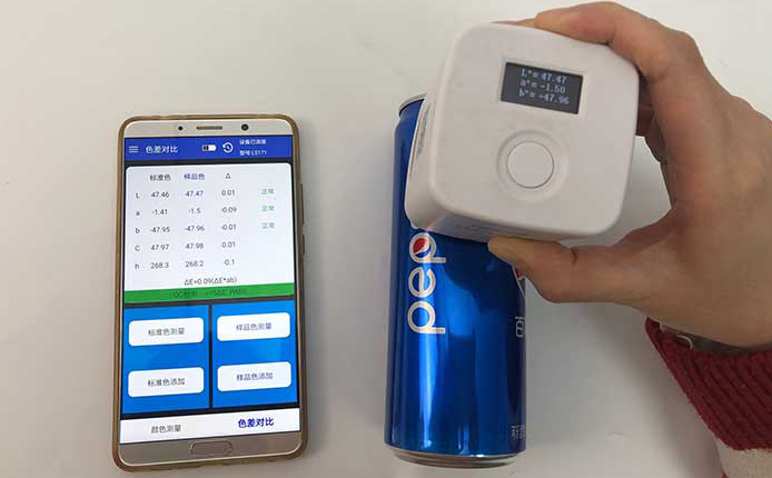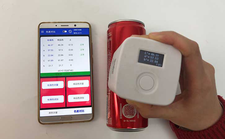 用色差儀對這兩個易拉罐的外觀顏色進行檢測后,色差儀連接的App顯示這兩個易拉罐的不同部位都是沒有色差的。可口可樂公司和百事公司的品質把控還是不錯的。測量易拉罐這種圓柱形的樣品時,我們應該注意要用測量口完全覆蓋住罐體,也就是要用色差儀緊壓在易拉罐表面,防止漏光。這款色差儀采用的是積分球的原理,體積小巧,有顏色測量和色差對比兩個功能。色差儀價格也十分優惠,是一款適合顏色測量并且經濟適用的精密顏色測量儀器。