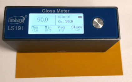 小編看了一下客戶的樣品,是以普通的鐵片為載體,將油漆均勻地涂抹在鐵片的表面,來測試這款油漆的光澤度的,客戶用了林上科技油漆光澤度儀LS191測試,數(shù)據(jù)如下:
