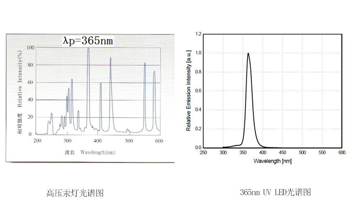 眾所周知,紫外固化用高壓汞燈在我國(guó)是有國(guó)家標(biāo)準(zhǔn)的,《QBT 2826-2006》膠印紫外光固化油墨國(guó)標(biāo),該標(biāo)準(zhǔn)中有規(guī)定:墨膜紫外固化條件:80W/cm2高壓水銀燈,照射距離15.5cm,速度64m/min。但是固化用的LED燈卻一直沒(méi)有出具國(guó)家標(biāo)準(zhǔn),很多企業(yè)還是在使用高壓汞燈專(zhuān)用的紫外能量計(jì)去測(cè)試LED光源,但是這種做法是非常不專(zhuān)業(yè)的。因?yàn)楦邏汗療艉凸袒肔ED燈的光譜曲線圖相差很多(見(jiàn)下圖),所以測(cè)試應(yīng)該使用固化用LED燈專(zhuān)用的紫外能量計(jì)。