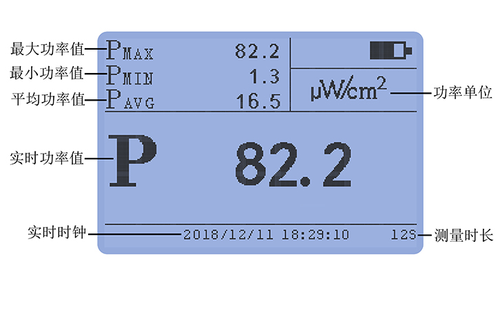 4.智能統計:測試時儀器會顯示測量功率的單位,最大值,最小值,平均值以及實時值,在屏幕的最下方還能顯示測量時長與日期